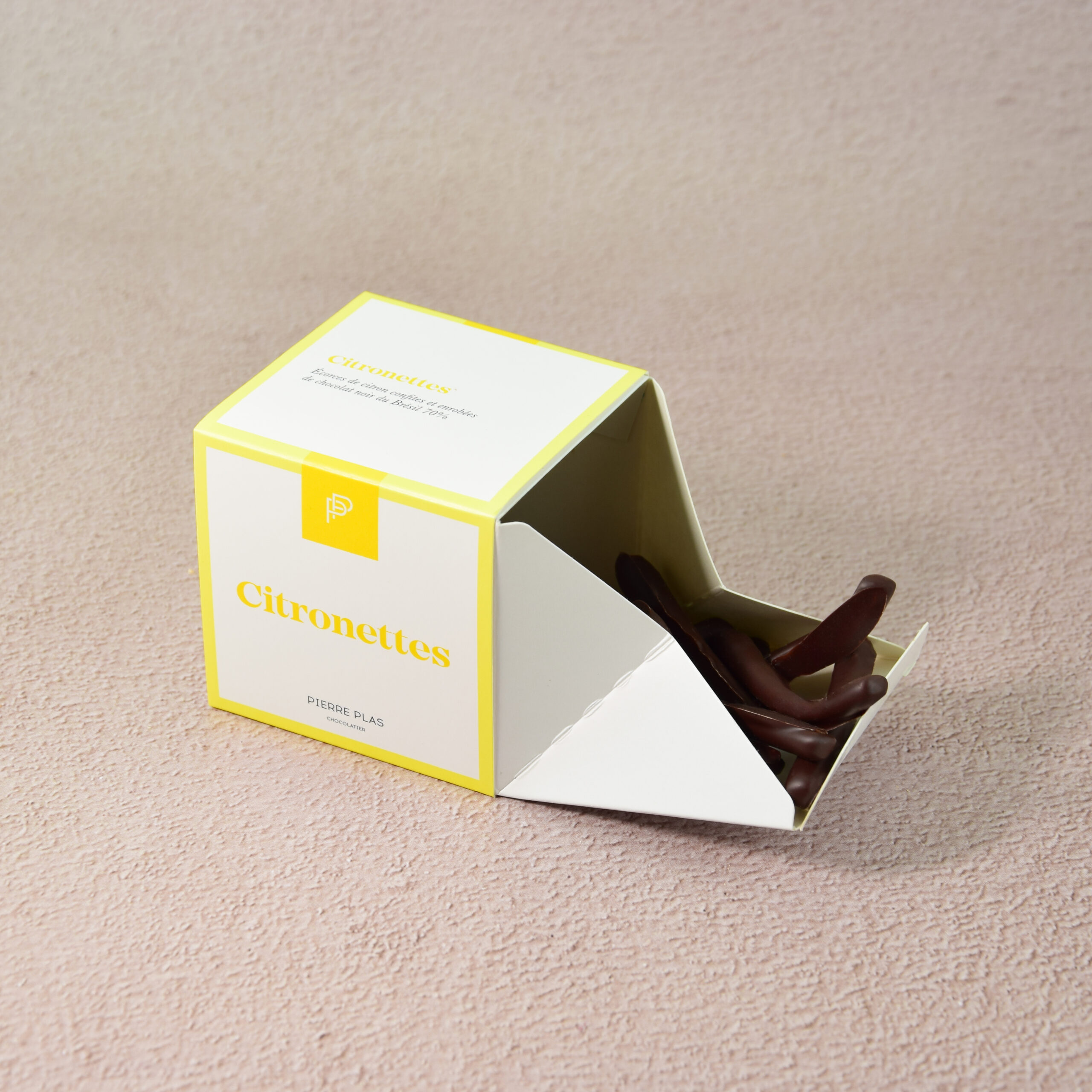 Écorces de citrons confites et enrobées d’une délicate couche de chocolat Noir du Brésil 70%.