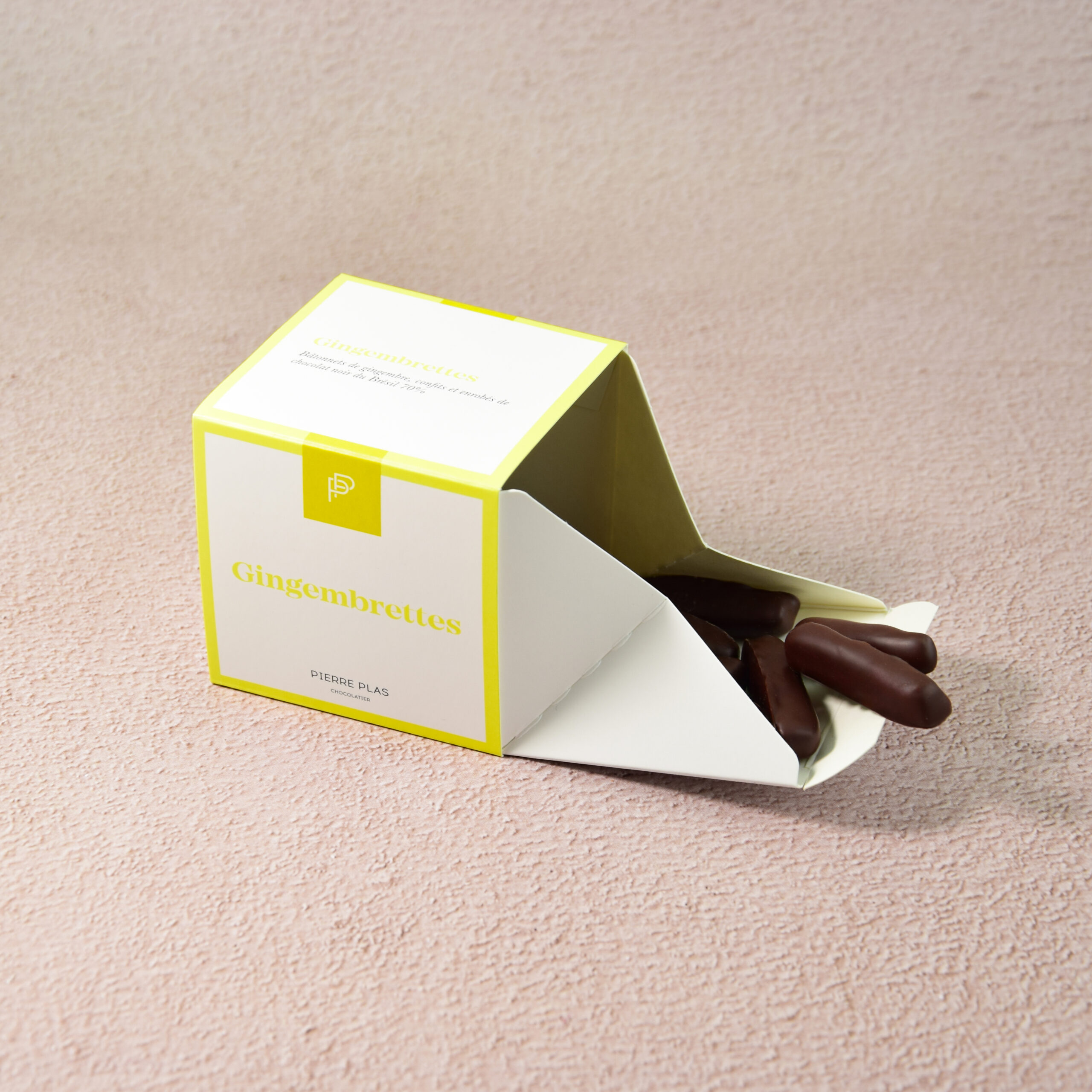 Bâtonnets de gingembre, confits et enrobés de chocolat noir du Brésil 70%.